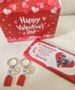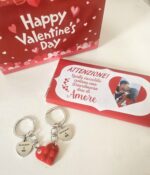 Box con 2 portachiavi lego love e tavoletta di cioccolato personalizzabile con foto .